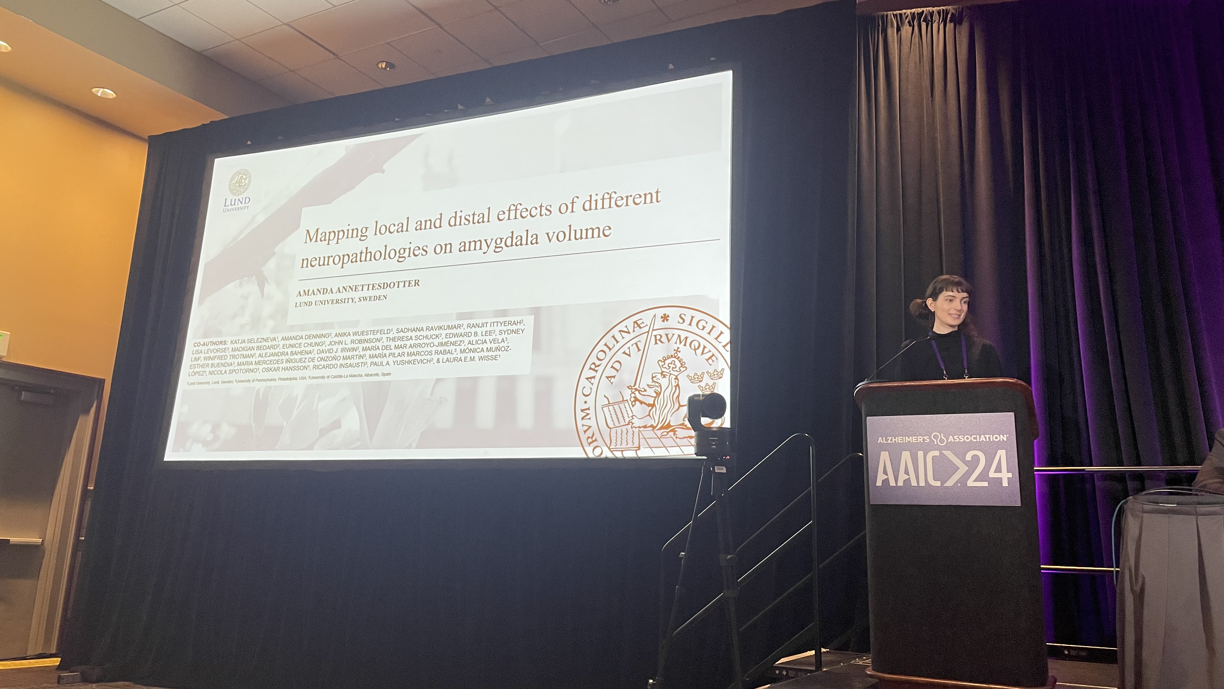 Amanda Annettesdotter presented recent work showing that tau pathology is distally associated with whole amygdala volume, through other medial temporal lobe regions. TDP-43 pathology, on the other hand, is locally assocaited with amygdala volume, so that the pathology was located within the amygdala itself. Results from exploratory analyses on the associations between neuropathologies and subregional amygdala volumes were also presented (see full abstract here). Taken together, this work contributes to the understanding of how distinct neuropathologies relate to amygdala atrophy.